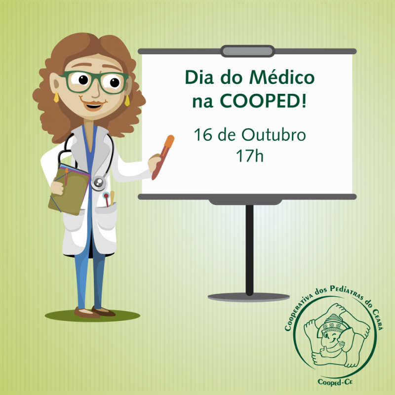 A Cooperativa dos Pediatras do Ceará (COOPED-CE) realiza um dia especial de comemoração ao Dia do Médico em 16 de outubro, a partir das 17h, em sua sede. Na ocasião, também será realizada Assembleia Geral Especial (AGE).