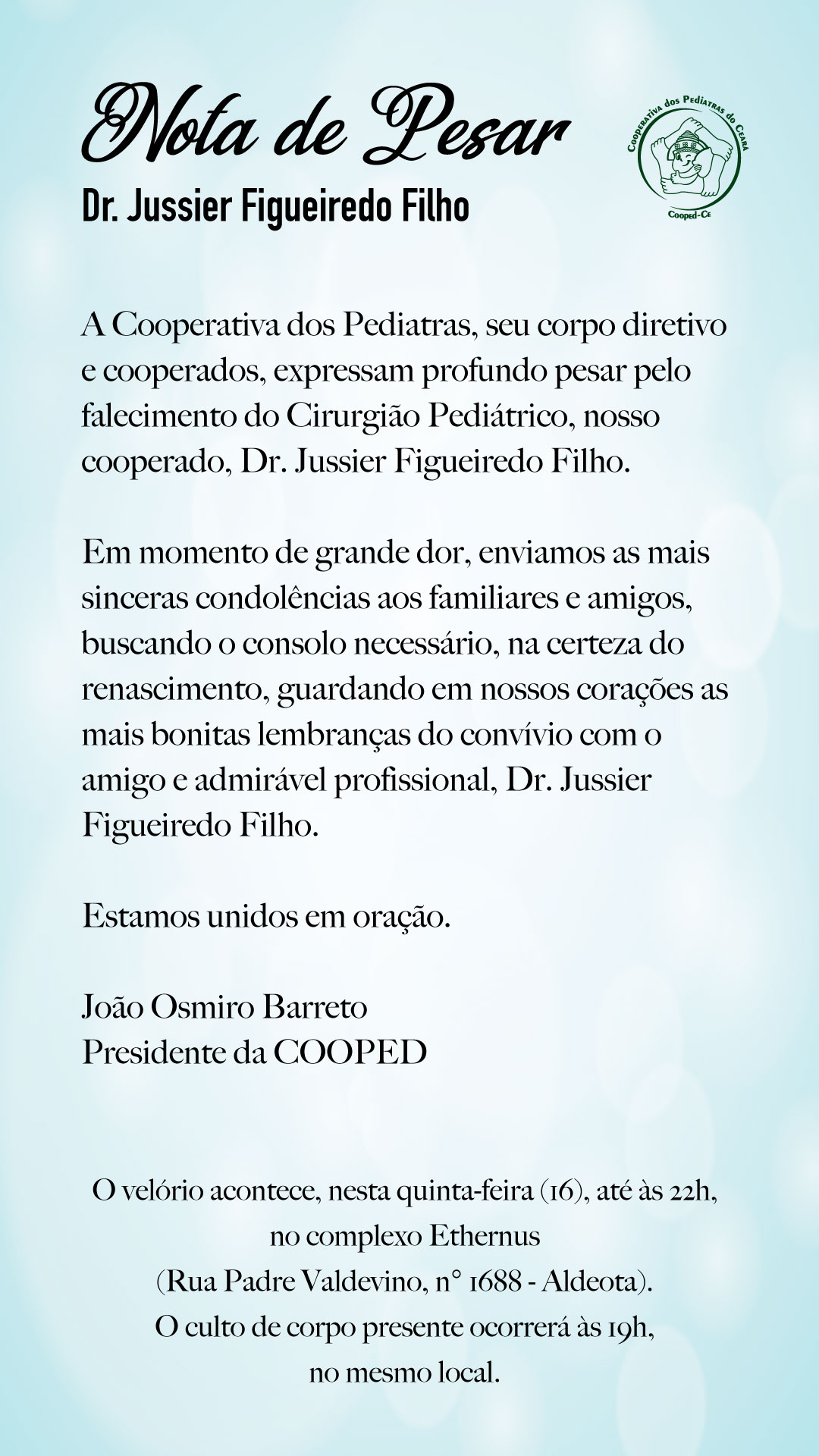 Início Notícias Nota de Pesar – Dr. Jussier Figueiredo Filho Notícias Nota de Pesar – Dr. Jussier Figueiredo Filho 16/08/2018 Share on Facebook Tweet on Twitter ARTIGOS RELACIONADOSMAIS DO AUTOR Especiais Guia de Diretivas do II Congresso Cearense de Desenvolvimento e Comportamento Infantil Notícias Curso Admissão Novos Cooperados Notícias Tripla celebração na Cooped Notícias Autismo Run. Vitória para todos. Notícias Festa Black & White Notícias Agosto Dourado III Últimas notícias Guia de Diretivas do II Congresso Cearense de Desenvolvimento e Comportamento... 03/12/2025 Curso Admissão Novos Cooperados 12/11/2025 Tripla celebração na Cooped 01/08/2025 Autismo Run. Vitória para todos. 05/05/2025 Festa Black & White 06/12/2024 Agenda